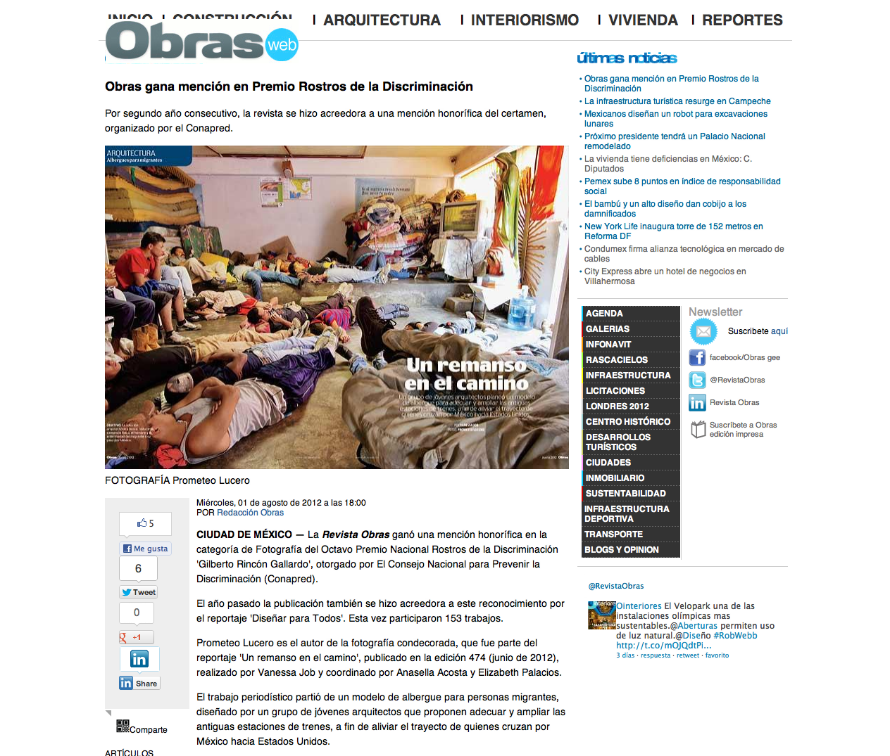Mención honorífica el premio Rostros de la Discriminación 2012 por el proyecto "Lechería, un remanso en el camino", publicado en Revista Obras.