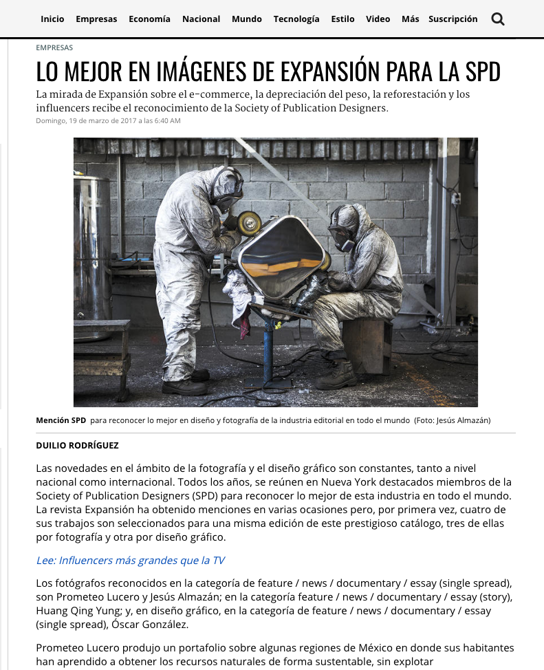Mención, Society of Publication Designers 2017, categoría feature / news / documentary / essay (single spread), revista Expansión.